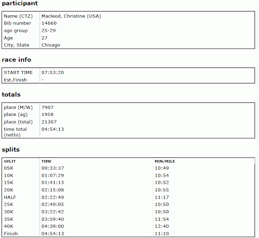 So the update on the internet is…(drum roll please)…I will officially be back online next Wednesday! You can expect a regular return to blogging then. The initial “back in the game” post will, of course, be a re-cap of Chicago. To tide you over until I have the time to tell my version of events, I’ll let the numbers tell their own story: