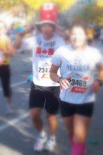 My other memories of this early part of the marathon include the first appearance of Canada man—who ran the whole race in a Dr. Suess-style maple leaf hat and kept loudly yelling that it was Melissa’s birthday. I also recall a picturesque scene of little helicopter tree seeds whirling down on the passing runners. I’m not exaggerating on the picturesque bit. The girl behind me audibly lamented the fact that she hadn’t brought her camera with her. (You know you’re slow when…)