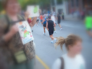 Shortly after the 4-mile marker, my reverie on the failings of GPS technology was disrupted by screaming and cowbells. Not that there hadn’t been lots of that before, but this time it was particularly loud. The entire Handsome J clan, plus Mom, were lined up in the middle of the street holding an array of signs and a large Scottish flag. (So that’s what it looked like. Pre-race, I had asked Handsome J how we would find them. Handsome J: “We’ll be holding the Scottish flag.” Me: “Uhhh…”)