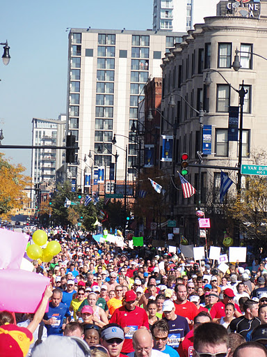 We did manage to pick up a light jog by mile 3 or so, but the crowds are so dense in those early, downtown Loop stages of the race that it always makes me wonder why people try to PR in Chicago. Yes, it’s flat, but there’s not exactly much in the way of elbow room. I knew we were well off a 4:45 pace, but then again, so was the pace group.
