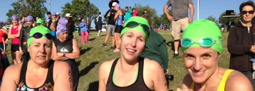 The current was flowing strongly from left to right, so I took Jeanine’s advice and lined up as far to the left as possible. This way, I would end up only mildly off course, and not in the middle of the lake. I also did the exact same thing I do at running races and agonized over how far forward to try to be in the pack. I knew I wasn’t a great swimmer, but Jeanine had told me some people doggy paddle the whole thing. I scanned my competitors and tried to guess based on their outfits who was likely to be a paddler. My basic logic was “tri suit = definitely faster than me”, “no tri suit = probably faster than me”.