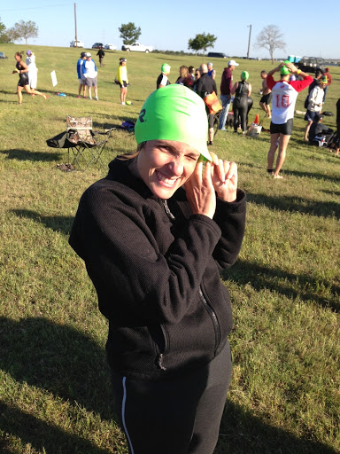 Here’s another fun fact about triathlon: In addition to writing your age (rounded up) on your calf, they give you a swim cap color-coded by age group. I suppose this is some form of safety measure, but I secretly suspect it’s a tool for humiliating the less-than-competent swimmers. You can actually count how many age groups you get lapped by.